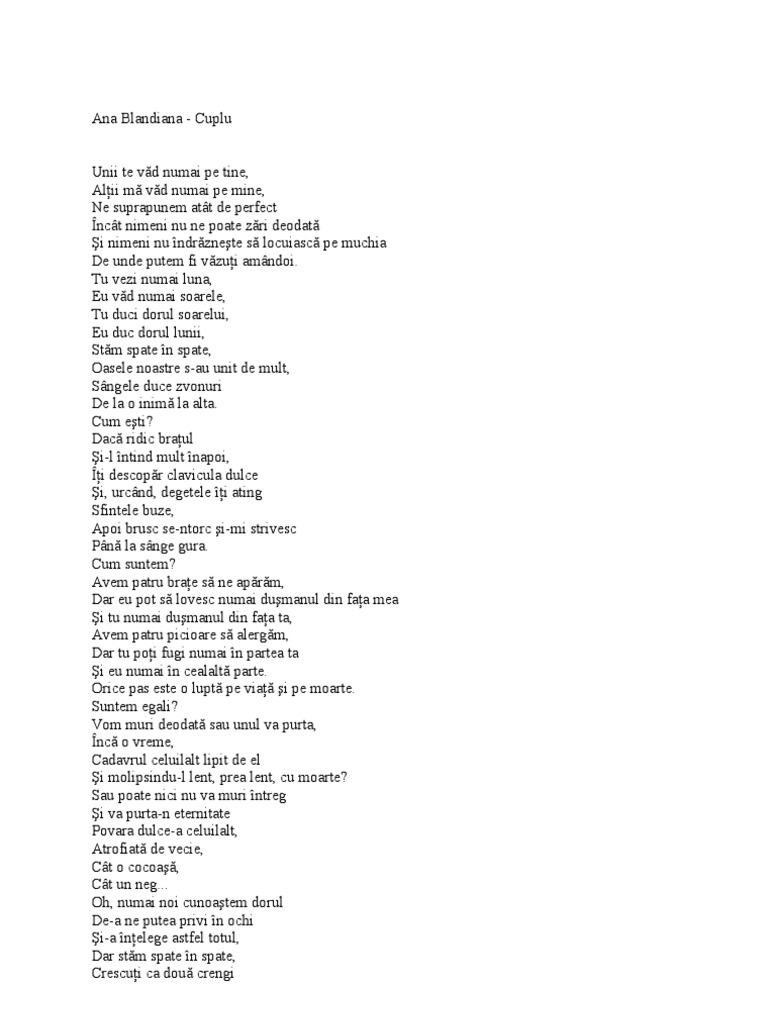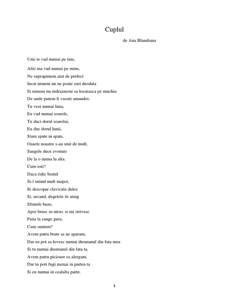 Lucrarea reprezinta un comentariu pe text al poeziei cuplu de ana blandiana realizat de eleva paula vaida din clasa a ix a e de la c n. Unii te văd numai pe tine alții mă văd numai pe mine ne suprapunem atât de perfect încât nimeni nu ne poate zări deodată. Versuri ana blandiana cuplu cuplu unii te văd numai pe tine alţii mă văd numai pe mine ne suprapunem atât de perfect încât nimeni nu ne poate zări deodată şi nimeni nu îndrăzneşte să locuiască pe muchia de unde putem fi văzuţi amândoi. Unii te văd numai pe tine alții mă văd numai pe mine ne suprapunem atât de perfect încât nimeni nu ne poate zări deodată şi nimeni nu îndrăznește să locuiască pe muchia de unde putem fi văzuți amândoi.