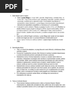 Hronicul și cântecul vârstelor. Romanul hronicul și cântecul vârstelor este o operă cu un caracter memorialistic pronunțat scrisă de către lucian blaga în perioada 1945 1946 dar publicată abia după moartea autorului în anul 1965. De asemenea citind eseul vei afla că lucian blaga personajul principal al romanului hronicul și cântecul vârstelor a fost un copil respectuos și bine educat care s a remarcat mereu la școală prin rezultatele și răspunsurile deosebite.