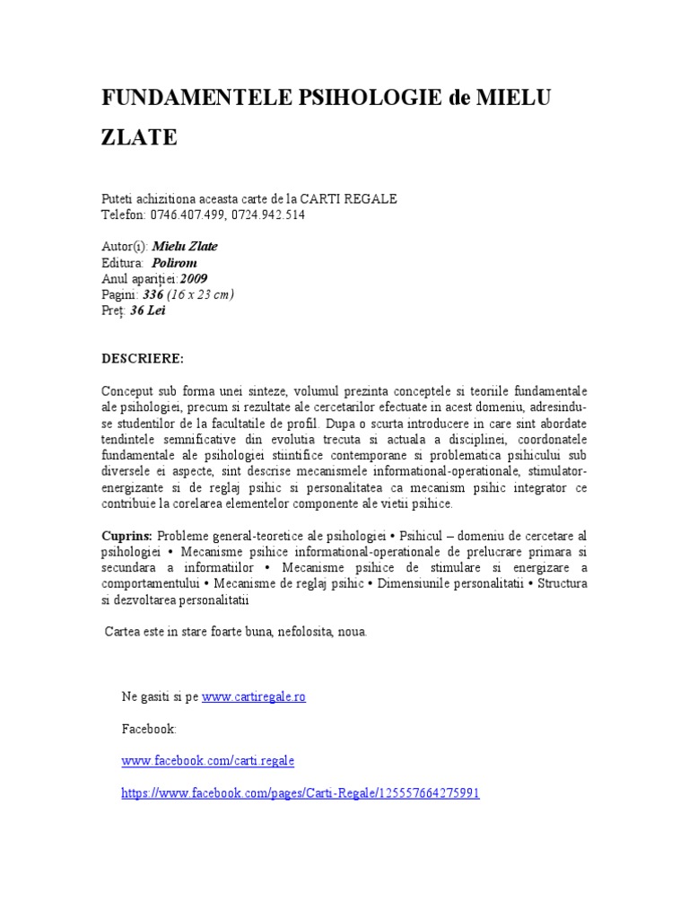 Academia edu is a platform for academics to share research papers. Doctor in psihologie din 1969 cu o teza coordonata de gheorghe zapan. Redactor sef la revista de psihologie organizationala centrul de psihologie aplicata universitatea. Mielu zlate 1937 2006 a fost profesor universitar seful catedrei de psihologie a facultatii de psihologie si stiintele educatiei universitatea din bucuresti.