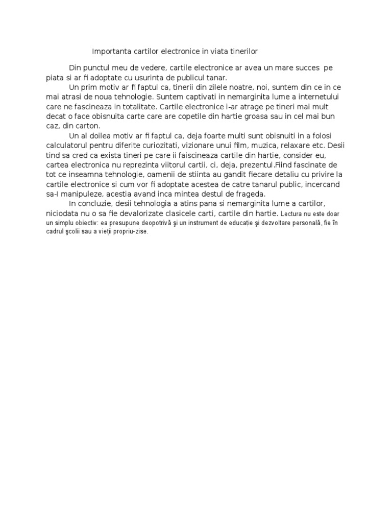 Nevoia de poezie a omului modern text argumentativ poezia este parte integranta a literaturii oricarei culturi. Din păcate tot mai puțini adolescenți citesc lectură particulară în timpul lor liber. Este dovedit că în urma lecturării unei cărți cititorul își formează o părere aflând dacă acel gen de carte li s a potrivit daca ar mai citi o astfel de carte sau dacă dorește să citească ceva diferit. Text argumentativ despre rolul lecturii în viața tinerilor este un eseu argumentativ care susține importanta lecturii în viața tinerilor.